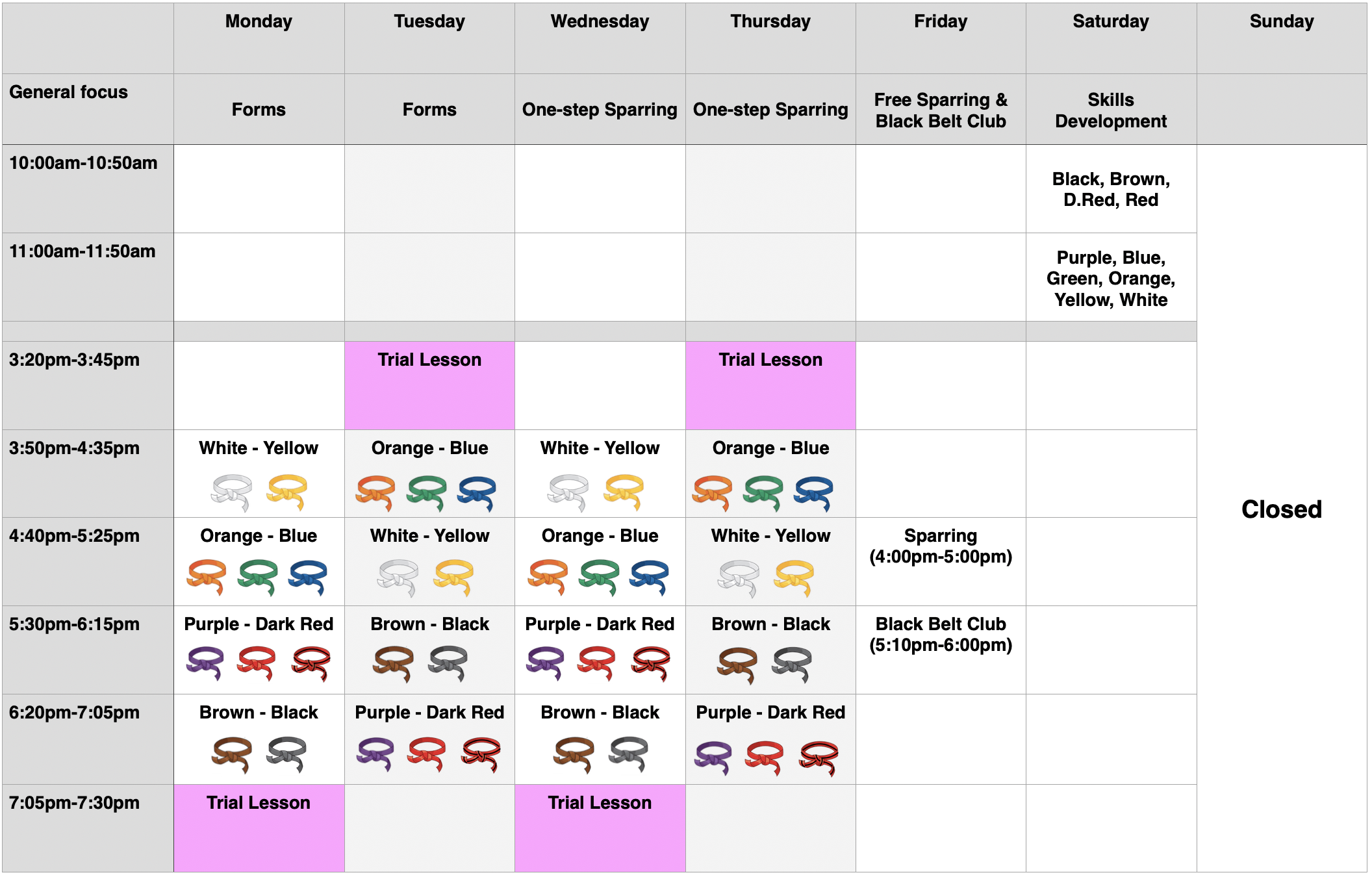 Our weekly schedule for in-class instruction is: